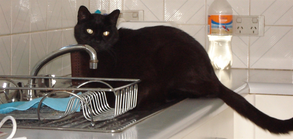 berry busted getting a drink from kitchen sink (he prefers the tap running)